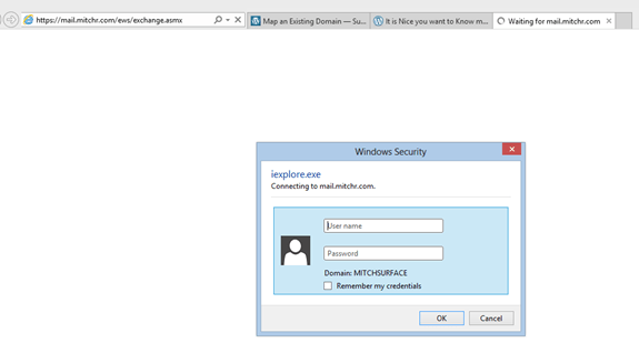 So I started this some time ago and wanted to continue to try to do the next part now that my lab is back up. In the last post we talked about auto discover and how it can affect authentication. So now I want to talk about other URLS that you may need to check. Let’s start with a list of all the URL’s you can try from internet explorer. I specifically call out using i.e. to test the URLS because it is what is in the middle of the stack whenever you make an HTTP or HTTPS call to a website from an application. i.e. will be in the stream and settings from i.e. can affect the web call. I will not cover the URL’s for auto discover since it was already covered.