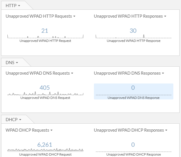 What is even more concerning is responses to WPAD requests. If you can’t stop them, or it takes time to stop them due to change control requirements. At least I want to know what is responding to those requests. As these may be an indication of a man in the middle attack especially if you do not use WPAD. So below is a chart from Extrahop that allows me to see how many requests and how many responses Extrahop is seeing in my environment.